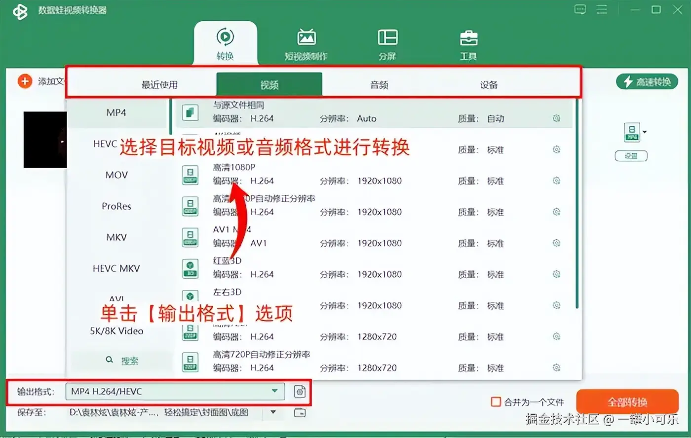 步骤2:导入文件后,单击【输出格式】选项,打开文件格式选择界面,选择目标视频或音频格式进行转换。