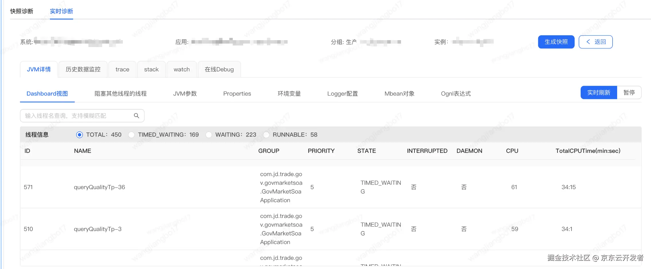 并发线程中所有的等待统一都使用了上文的方法,前文中的queryActTp处于WAITING状态可能也是执行没取消导致,修改部署后再观察分析。同样的调用方式 queryQualityTp 处于Timed_waiting状态可能与一次父任务中子任务的执行耗时有关,见上文监控,活动和资质相差较大,具体原因有待进一步分析。