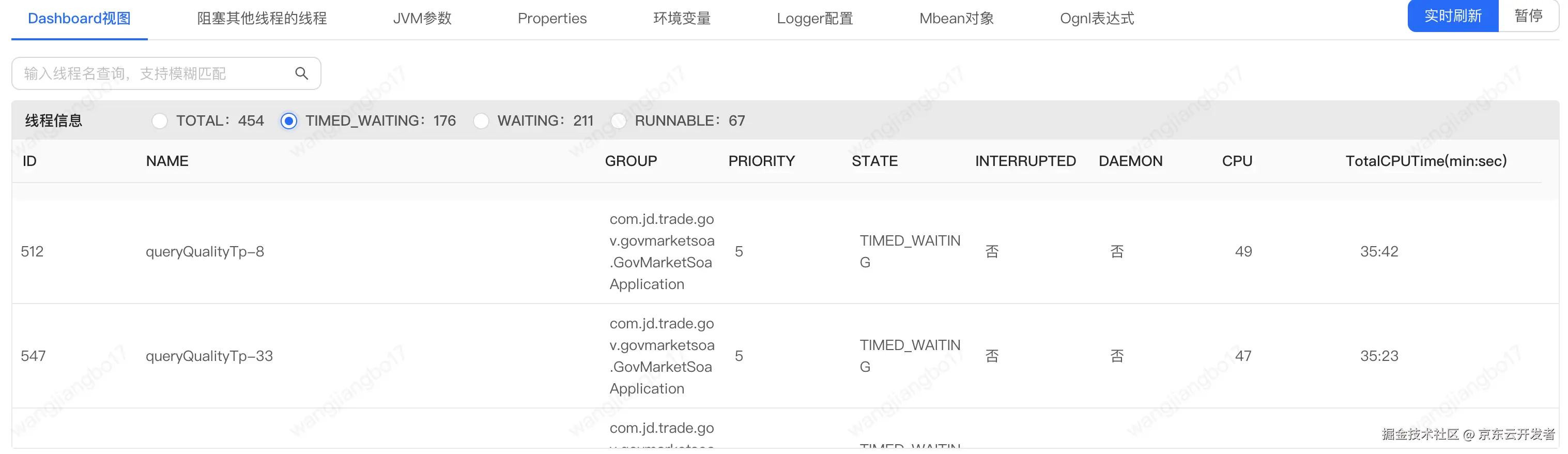 通过上图我们可以发现timed_waiting的topN线程都是查询国补资质的。