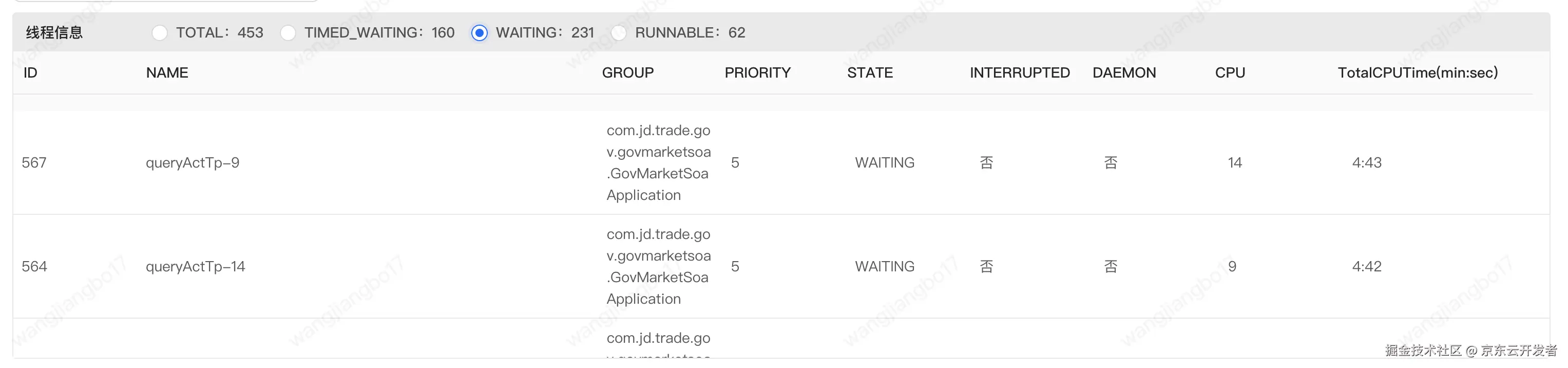 通过上图我们可以发现waiting的topN线程都是查询国补活动的。