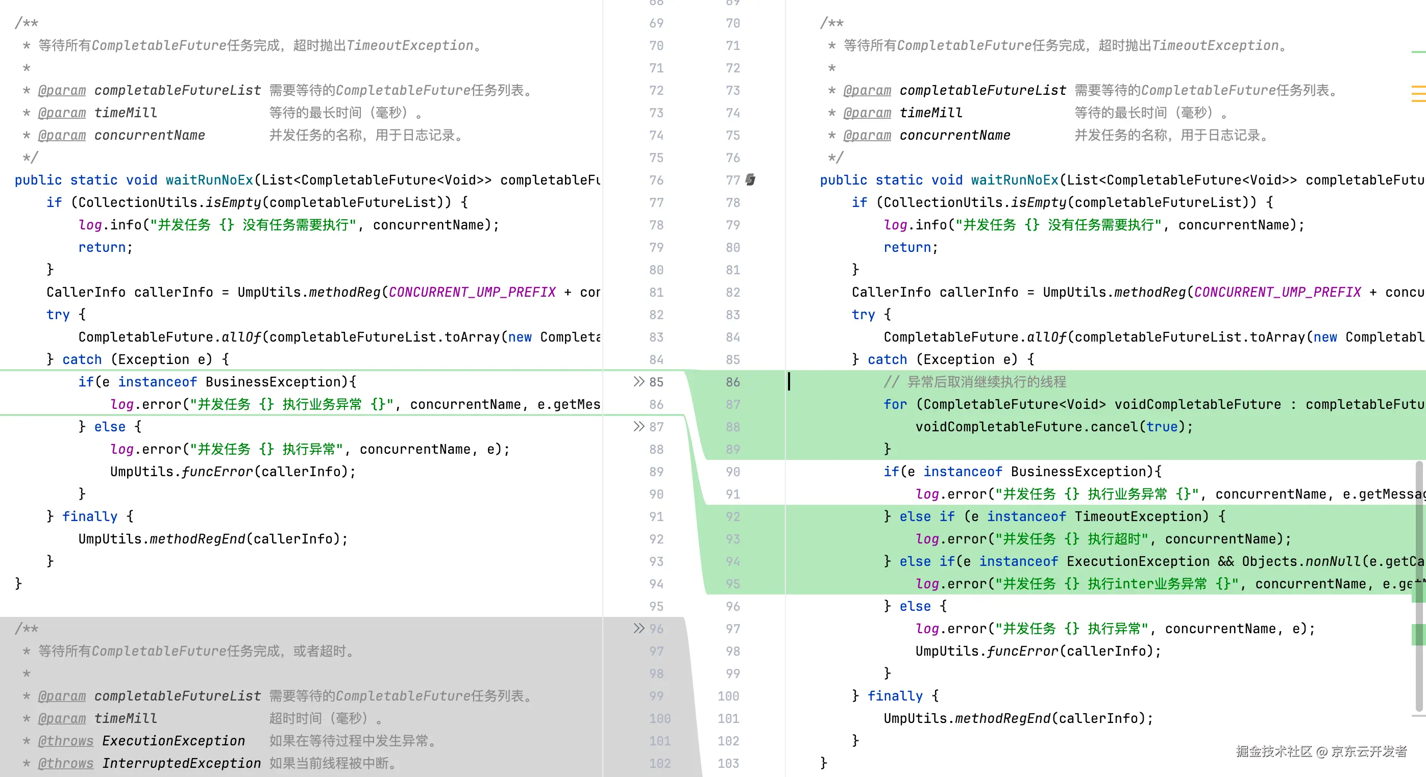 1、 allOf异常后,取消所有线程的继续执行。这么做为了防止有些线程超时后仍在执行,浪费部分CPU资源,线上发现确实存在较多的超时情况。
