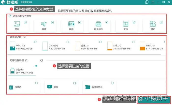 步骤1: 在电脑里打开数据 蛙恢复专家,进入软件的首页,在上方选择需要扫描的文件类型,在中下方选择文件丢失位置进行扫描,然后点击右下角的按钮;