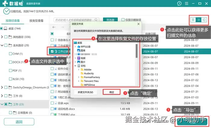 步骤2: 在软件的扫描结果中选择自己需要恢复的文件(可以单选也可以多选),然后点击“导出”;点击完“导出”后在弹窗中选择恢复文件的存放位置。