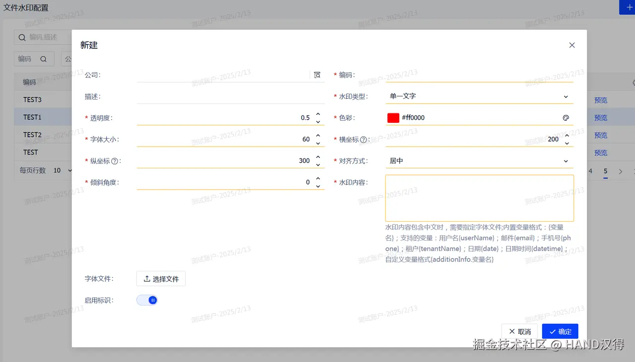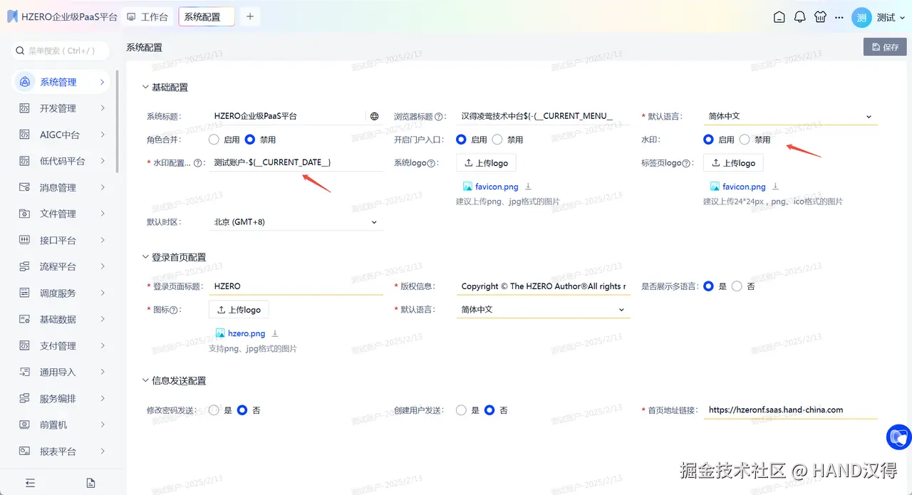 用户可直接在“系统配置”界面配置系统界面是否开启水印显示,并支持系统变量映射。