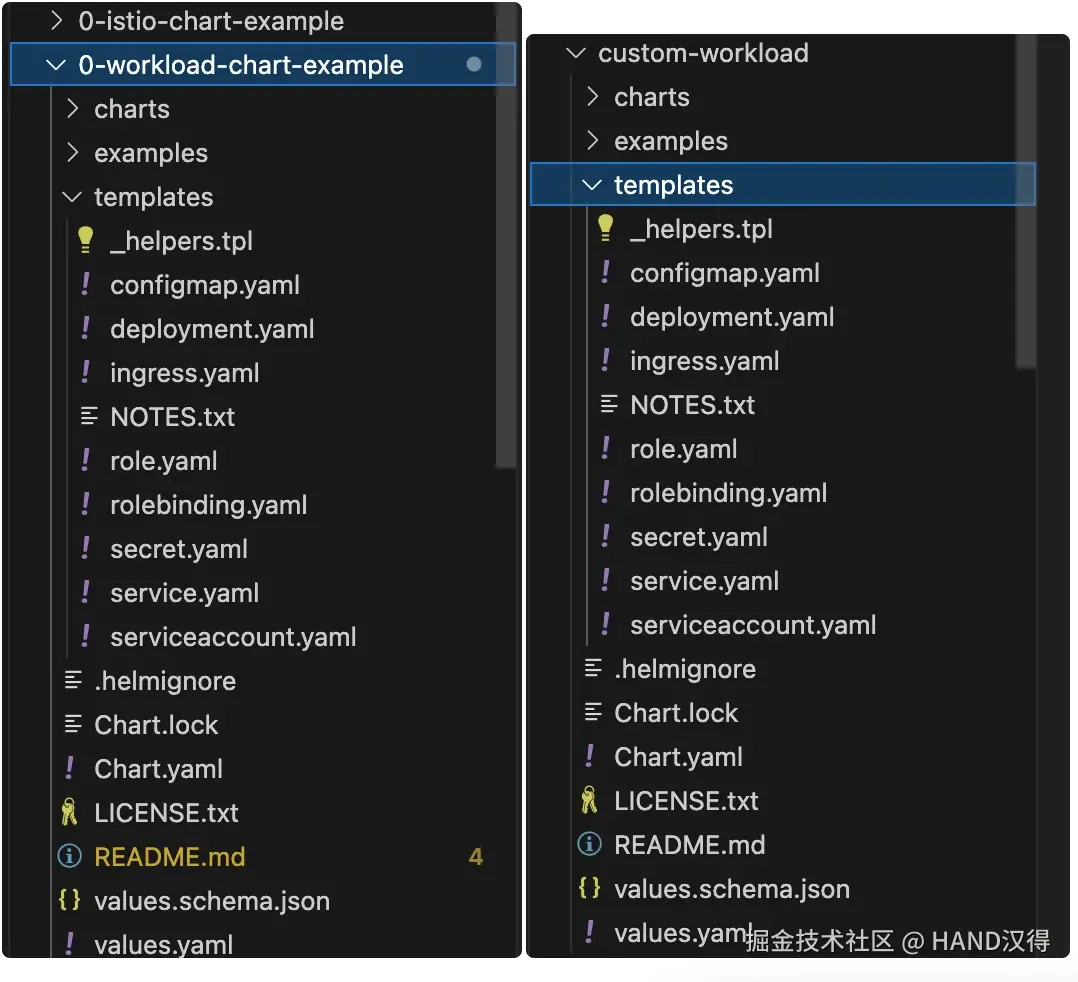 我们提供两类制品模板供您快速开始,其中 0-istio-chart-example 用于服务治理类组件, 0-workload-chart-example 用于工作负载类组件,可以帮我们快速搞定如下各种骨架逻辑,通过少量修改(例如,修改默认端口、增加应用启动参数、增加扩展资源类型等等)即可快速实现一个符合业务需求的定制化应用制品(本例中是 custom-workload ):