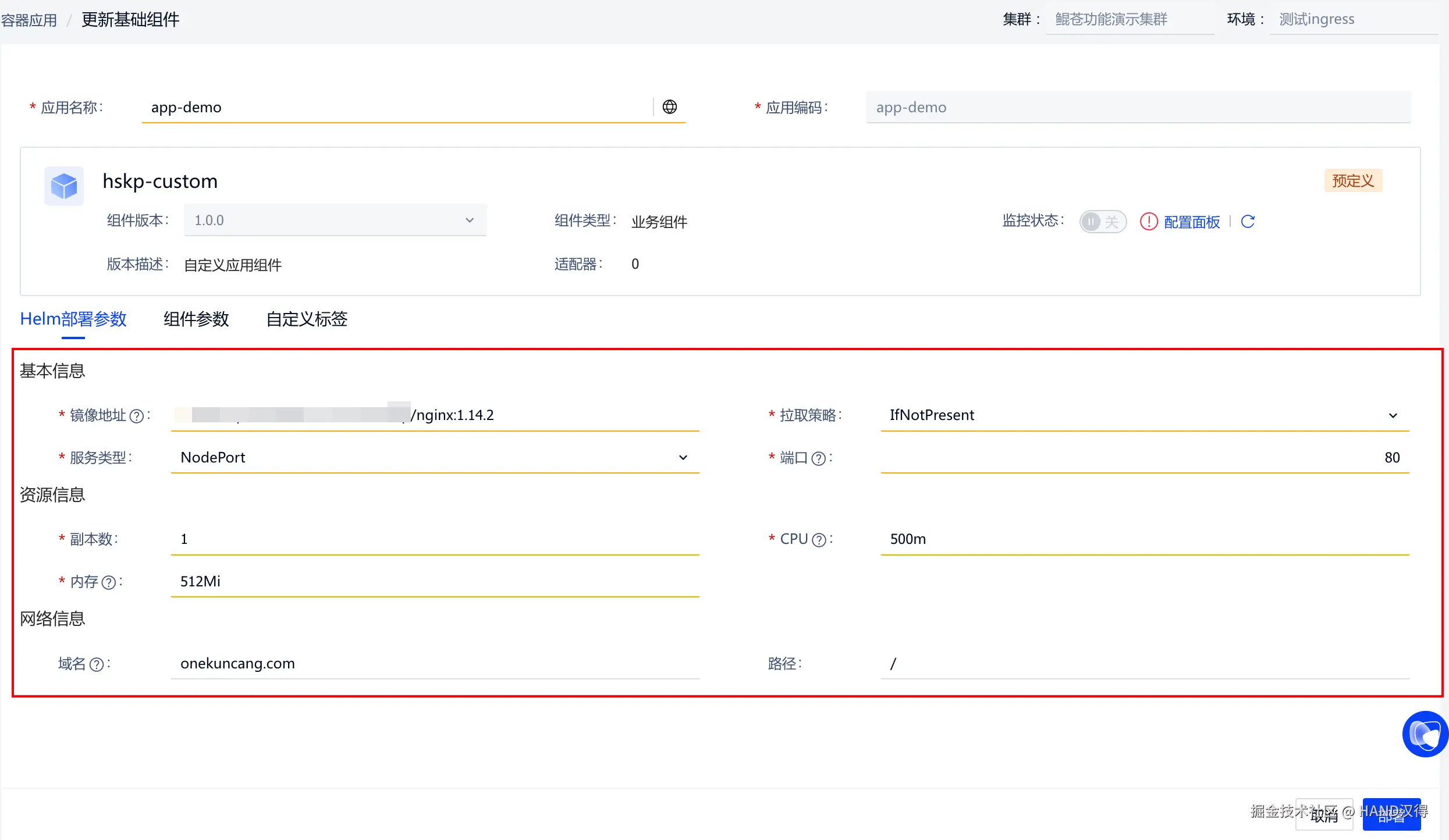 部署基础组件,一键表单可视化部署。只需要填写必要参数信息即可,例如,镜像、端口、副本数、域名等