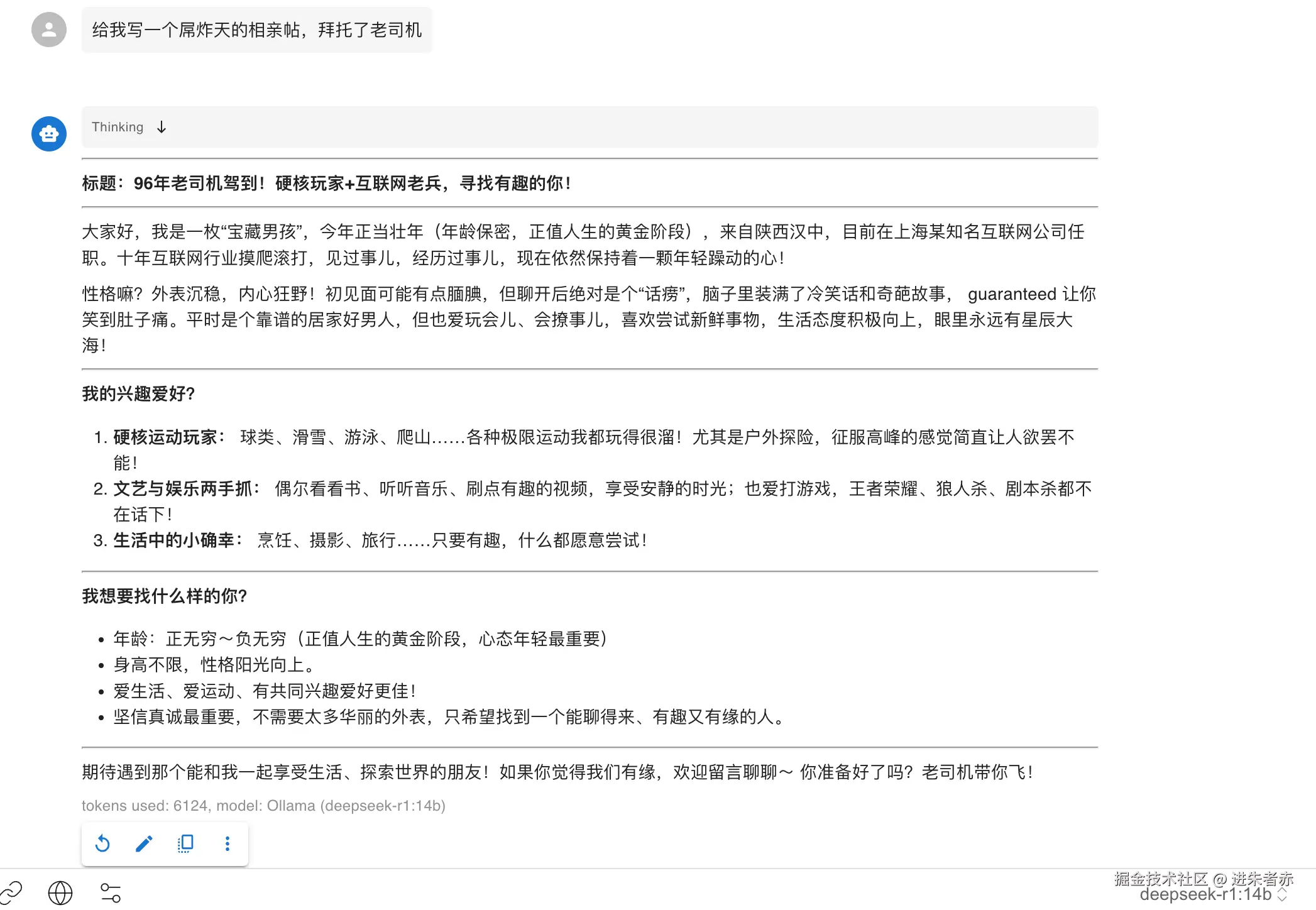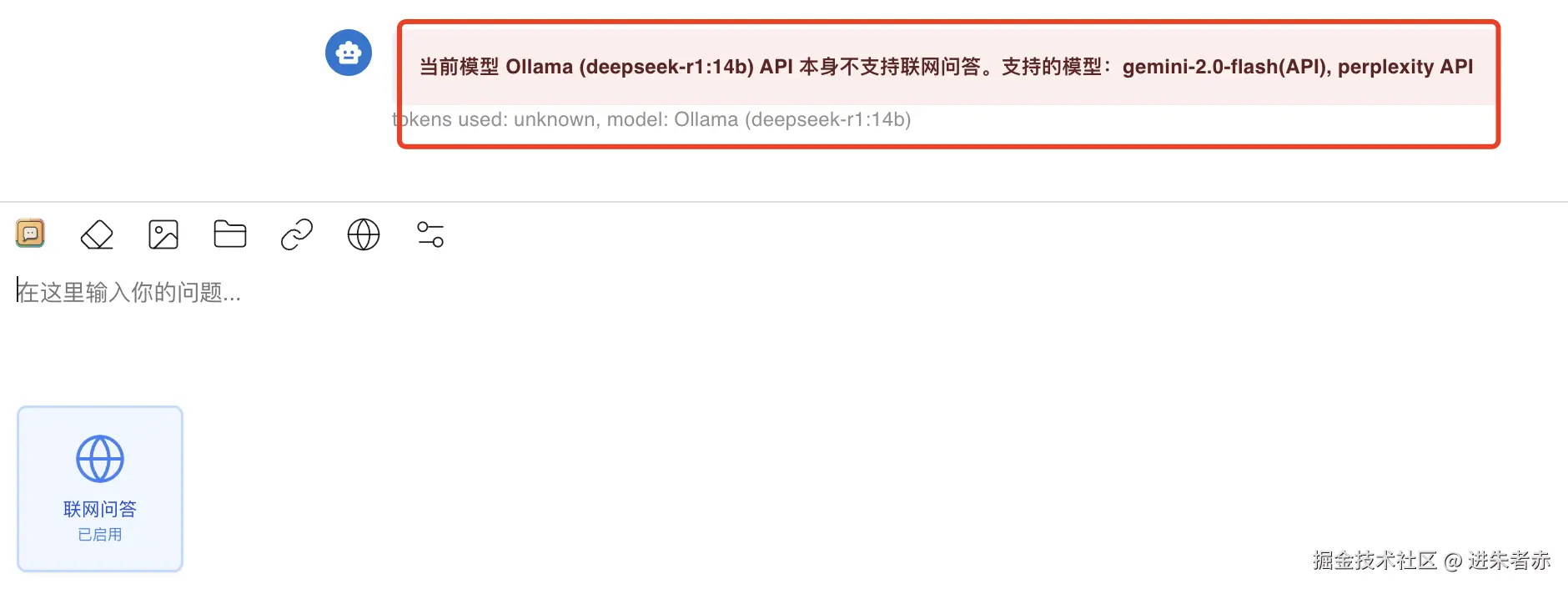 提示:当前模型 Ollama (deepseek-r1:14b) API 本身不支持联网问答。支持的模型:gemini-2.0-flash(API), perplexity API