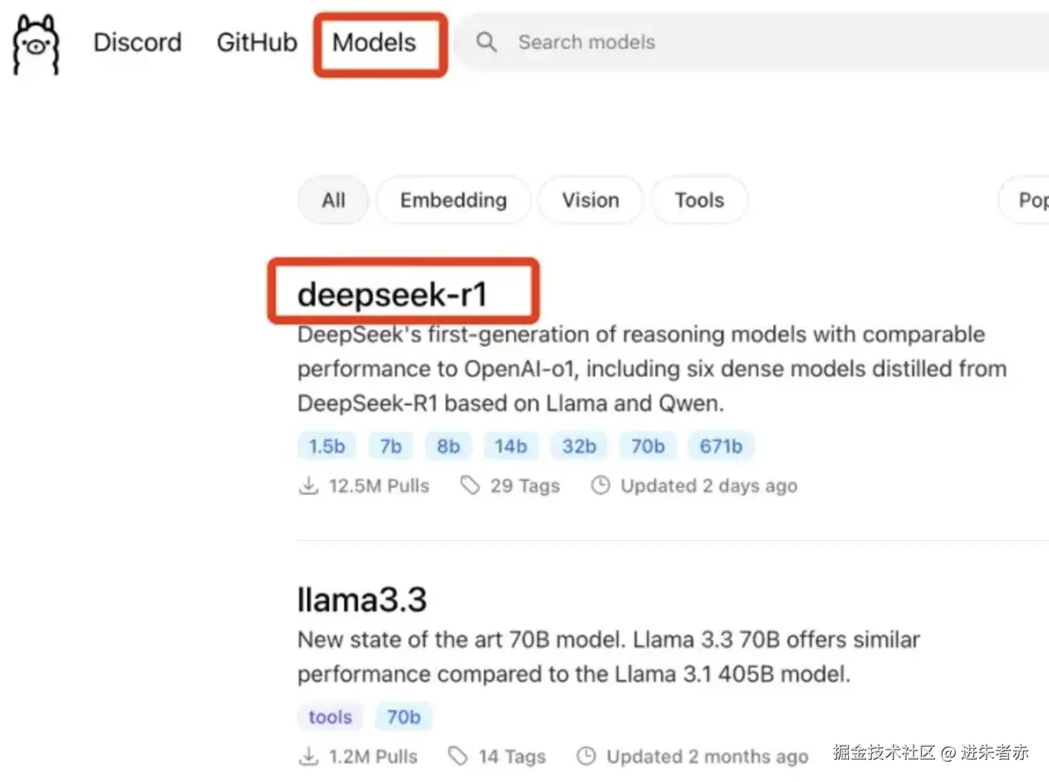 2.1. 回到Ollama官网,点击Models,找到deepseek-r1模型;