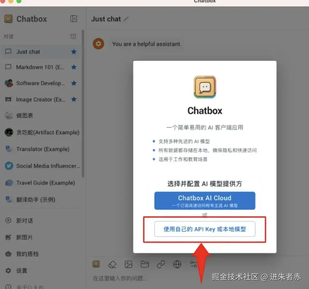 3.3. 选择“使用自己的API Key 或本地模型”选项;