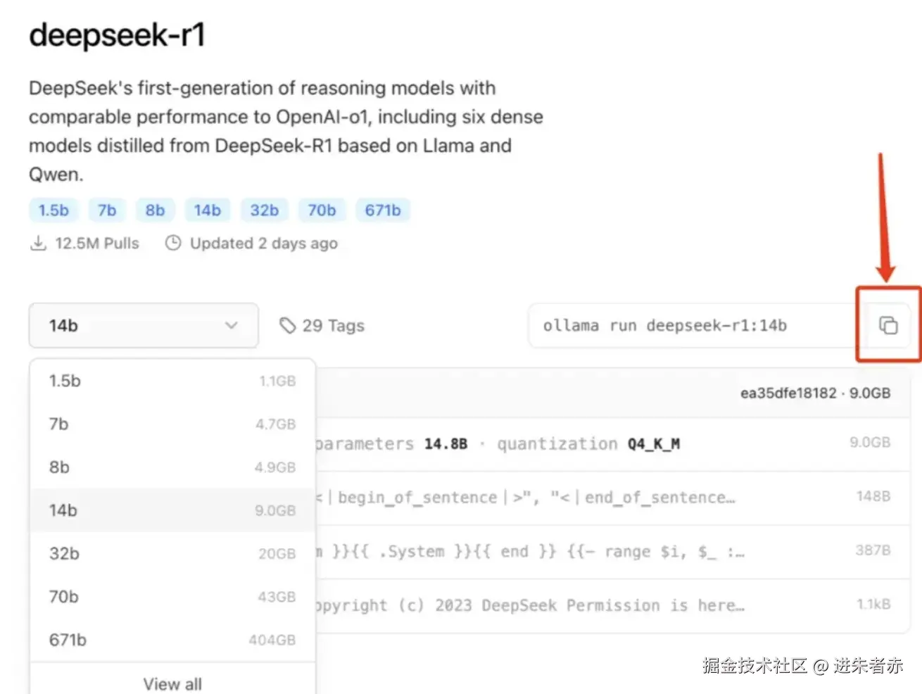 2.2. 选择对应的模型,点击复制按钮,复制DeepSeek-R1下载代码;