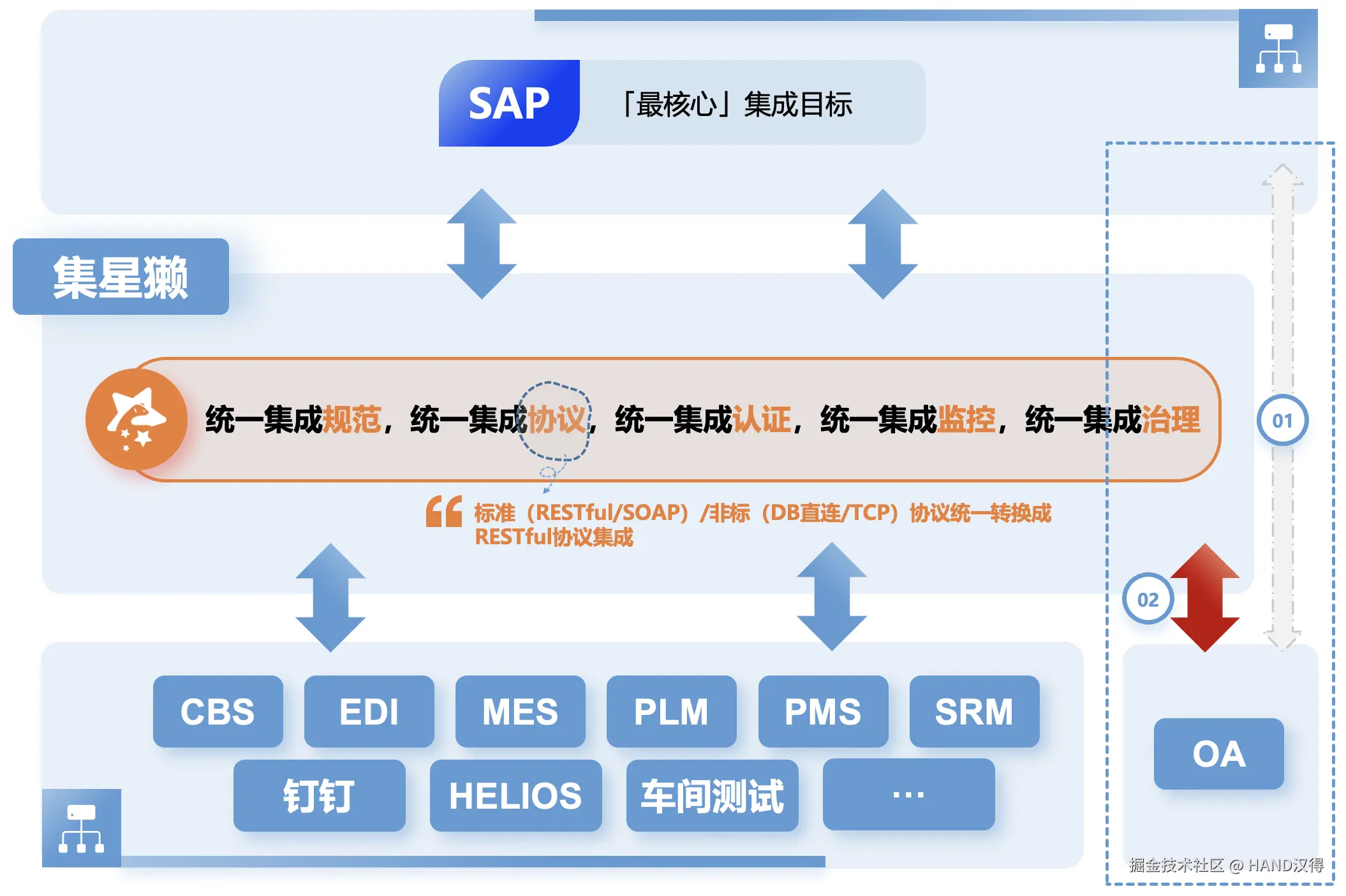 集星獭彼时无法支持SAP RFC协议的直接透传,新规范也无法约束OA系统。但OA系统依然被要求纳入集星獭管理范围:要求日志/监控/预警接入管理。