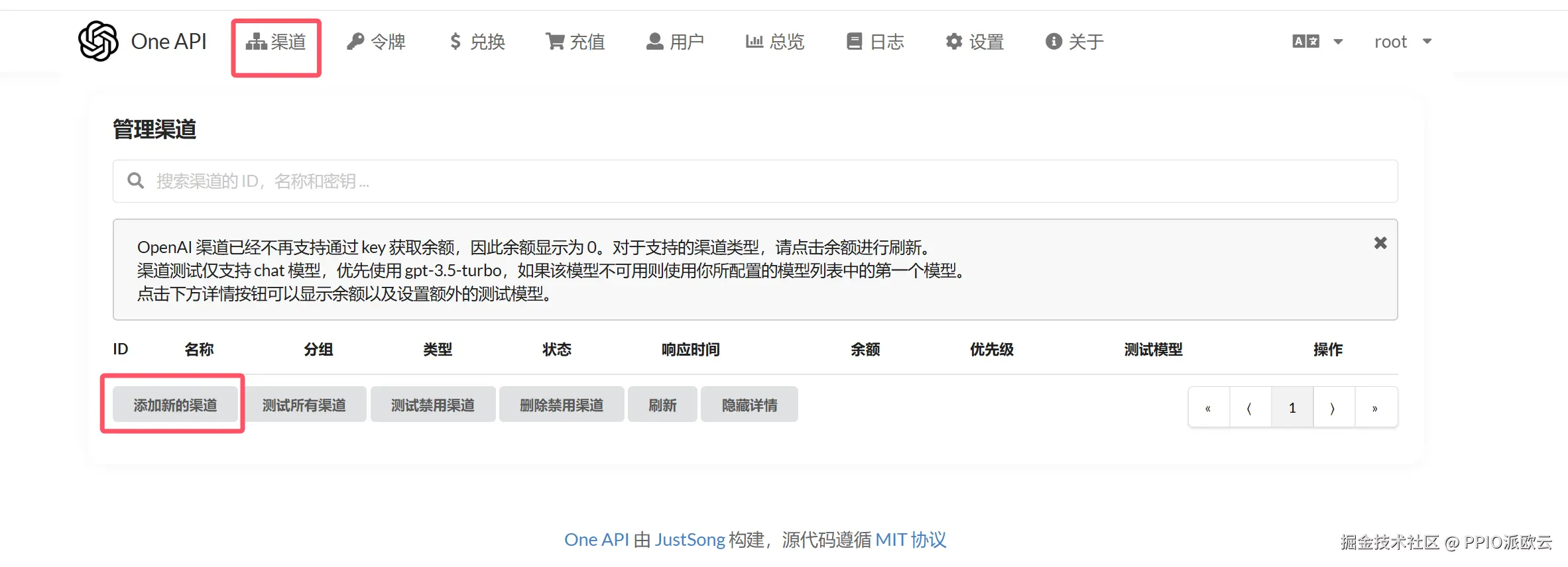 - 登录至OneAPI首页,点击渠道页面并点击添加新的渠道