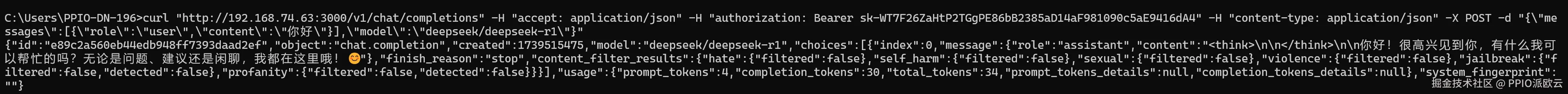 curl "http://${OneAPI部署的地址:端口}/v1/chat/completions" -H "accept: application/json" -H "authorization: Bearer ${OneAPI Token}" -H "content-type: application/json" -X POST -d "{"messages":[{"role":"user","content":"你好"}],"model":"deepseek/deepseek-r1-community","temperature":0.5,"presence_penalty":0,"frequency_penalty":0,"top_p":1}" - 会出现如下的返回结果: