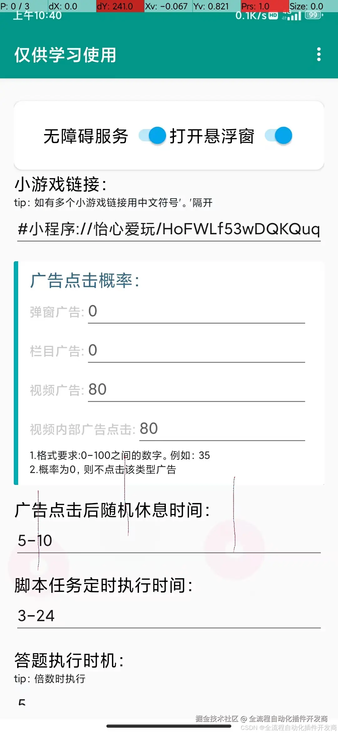 广告点击概率:(弹窗广告、插槽广告、视频广告入口、视频广告内第三方广告)(概率为0,则不点击该类型广告)