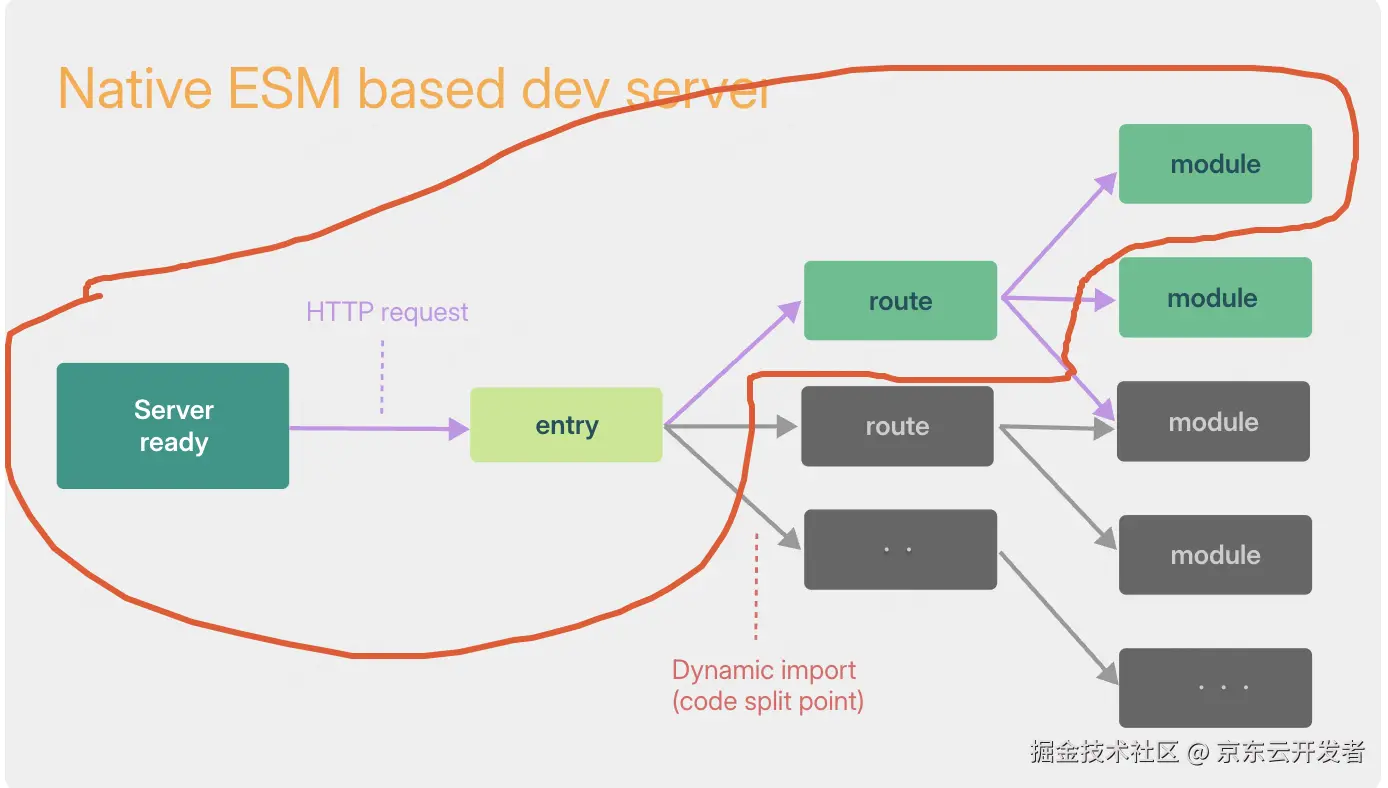 现在有 7000个模块,利用浏览器提供的ESM能力,解析首页需要的模块,就可以启动服务,实现快速启动。红色就是启动需要的模块。
