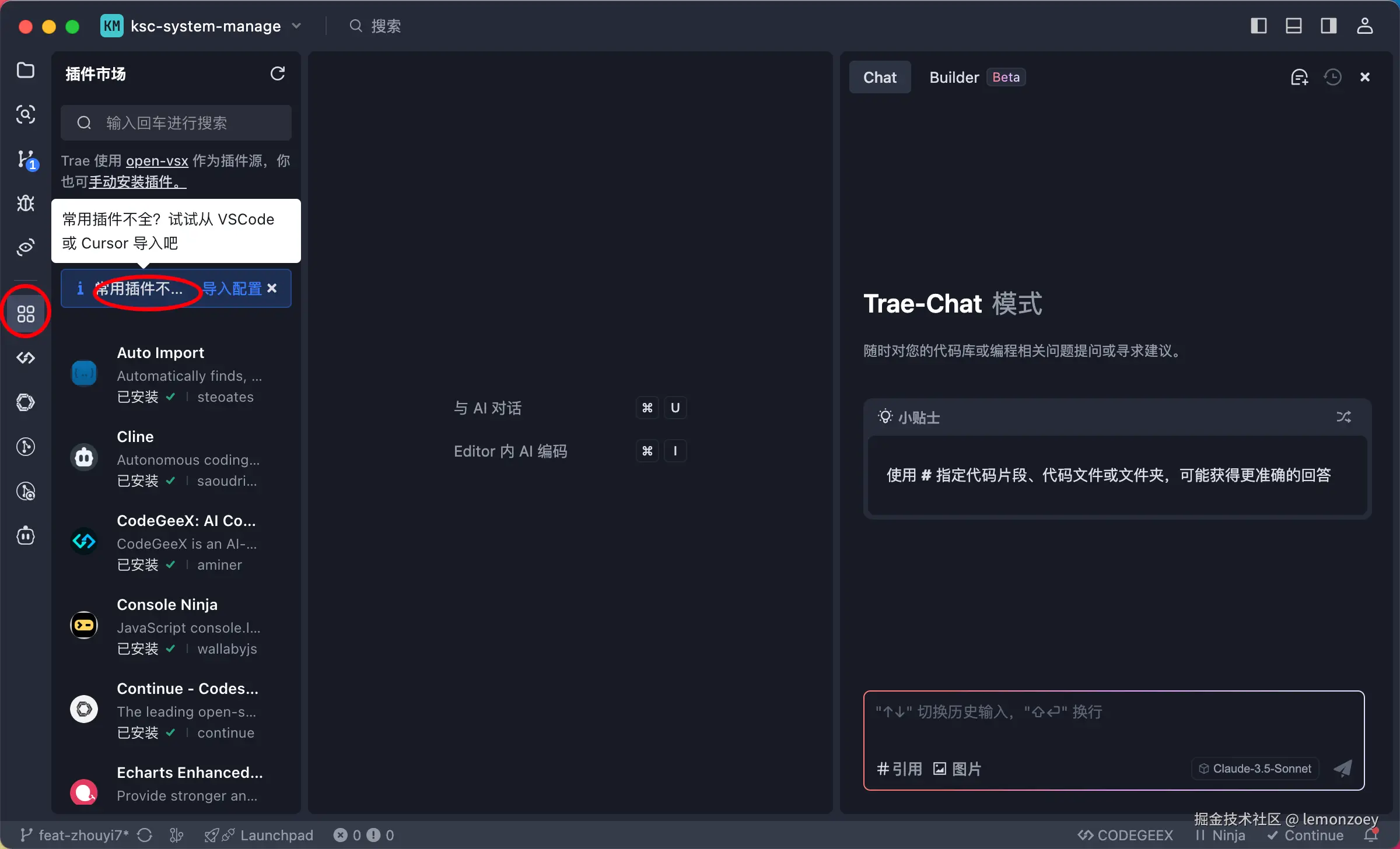 - 免费大模型集成:默认搭载 Claude 3.5-Sonnet 和 GPT-4o,提供无限量代码生成与问答服务,对标 Cursor 的付费模式;
