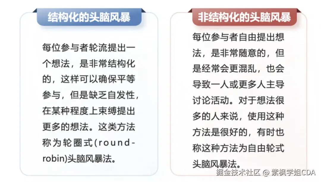 头脑风暴有两类不同的形式:结构化的头脑风暴和非结构化的头脑风暴。除了提出问题的顺序不一致外,这两种方法完全相同。