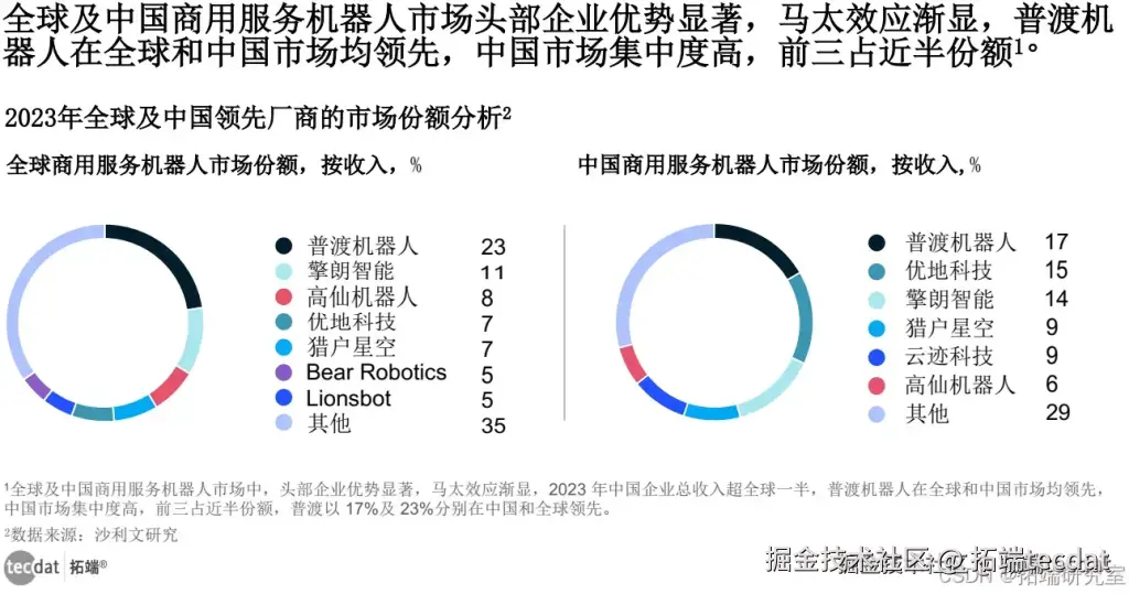 全球商用服务机器人市场的头部企业竞争优势突出,马太效应逐步显现。技术变革与各行业智能化转型升级需求的相互叠加,致使对商用服务机器人的需求持续增长,从而推动了该行业的快速发展。在 2023 年,中国商用服务机器人企业的总收入超过全球的一半,而在全球范围内,诸如 Bear Robotics、Lionsbot 等均为头部参与者。以 2023 年的收入来衡量,普渡机器人在全球商用服务机器人市场中位列榜首,处于领先地位。