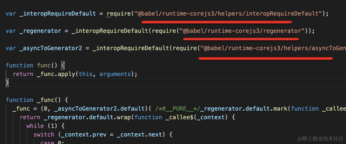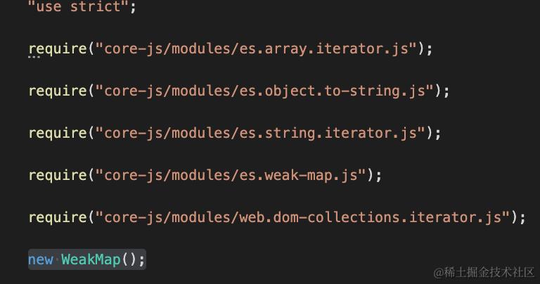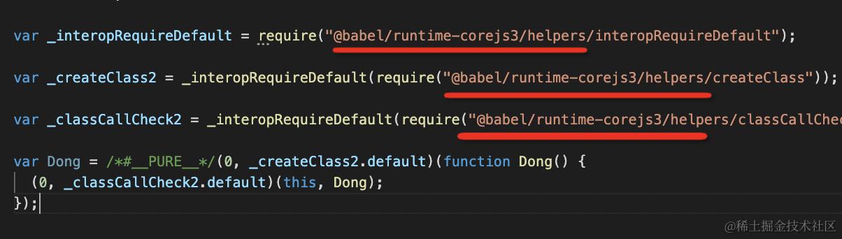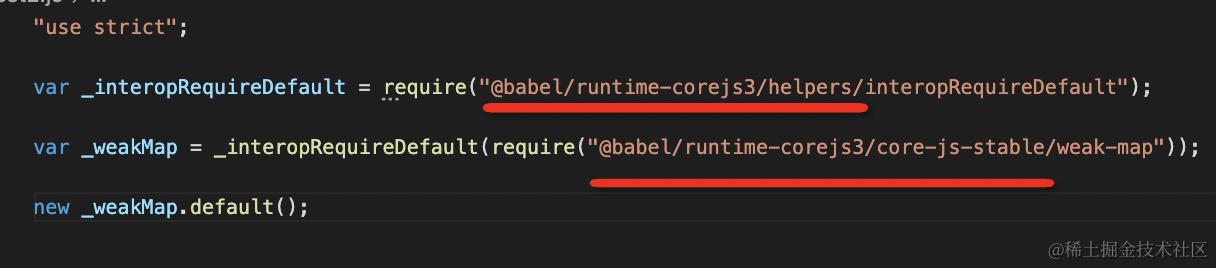 变成了从 @babel/runtime-corejs3 引入的形式,这样就不会多个模块重复注入同样的实现代码了,而且 core-js 的 api 也不是全局引入了,变成了模块化引入。