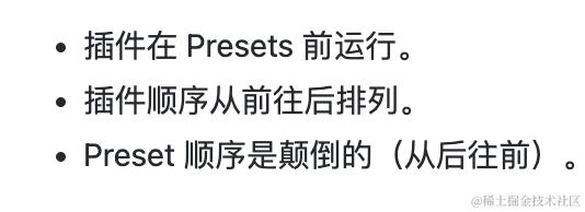 这个插件的原理是因为 babel 插件和 preset 生效的顺序是这样的(下面是官网文档的截图):