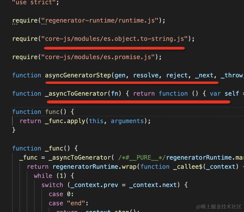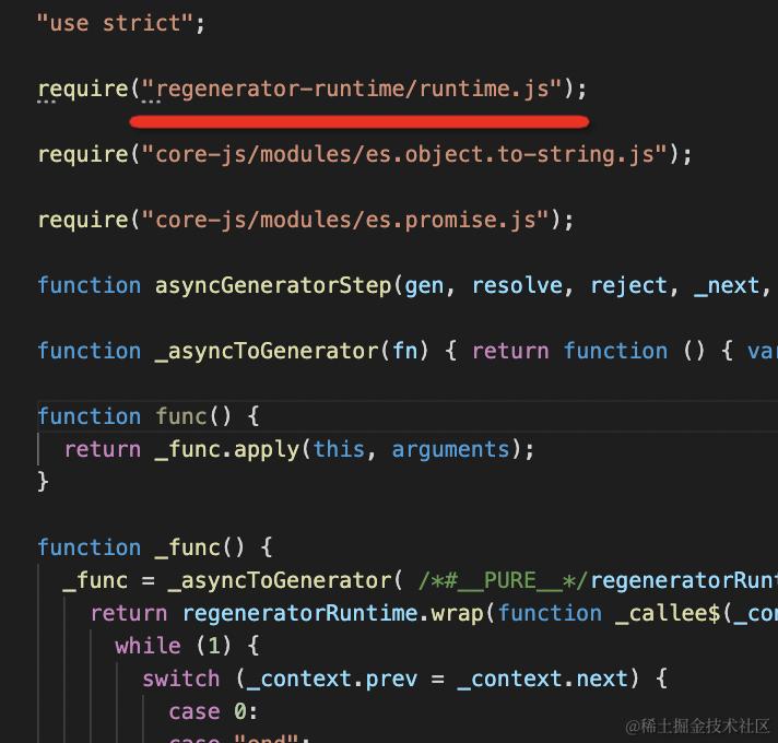 除了注入 core-js、helper 代码外,还注入了 regenerator 代码,这个是 async await 的实现。