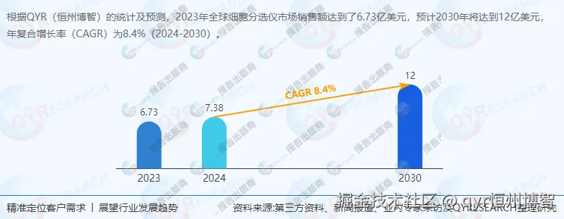 市场规模与增长:根据QYResearch最新调研报告显示,2023年全球细胞分选仪市场销售额达到了6.73亿美元,预计2030年将达到12亿美元,年复合增长率(CAGR)为8.4%(2024-2030)。中国市场在过去几年变化较快,虽然具体数据未给出,但预计其市场份额和规模将持续扩大。