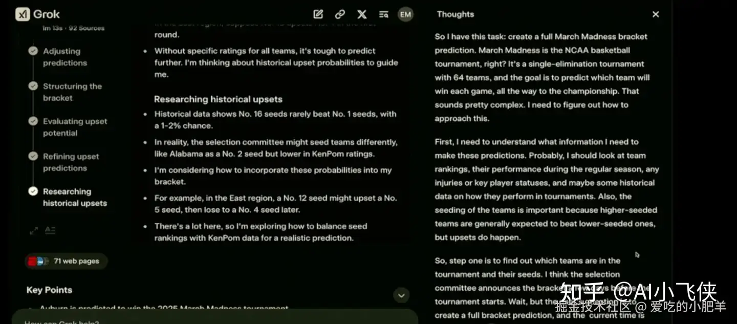 此次Grok 3的最大亮点在于引入了“思维链”推理能力,能够像人类一样逐步处理复杂任务,类似于Deepseek的思考方式。