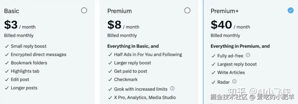 最后就是大家关心如何使用的问题,据悉X的Premium+会员稍后就能用上 Grok-3,刚刚我去看了一样X会员的费用,需要40美金,后续Gork还会推出专门的会员。