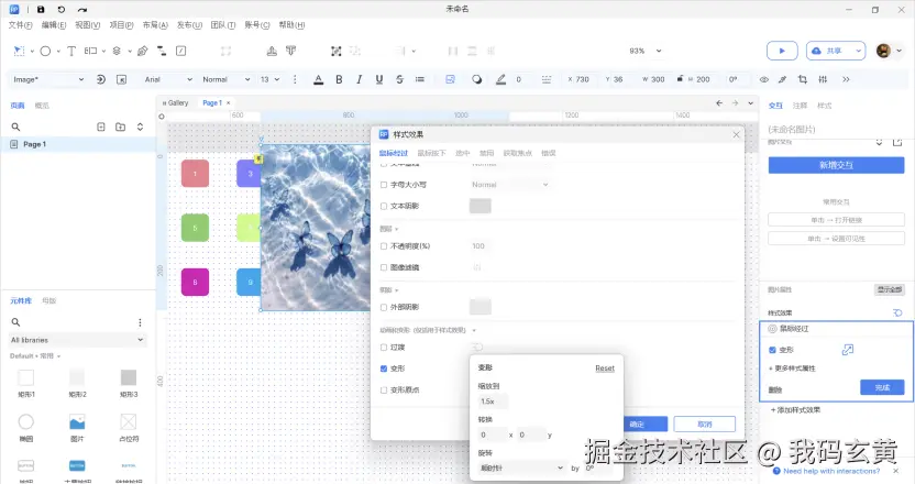 在【交互】里的【样式效果】点击【+添加样式效果】,选择【鼠标经过】或者其它然后选择【动画和变形】,可以设置【过度】的动画、【变形】、【变形原点】,可以说是相当丝滑。
