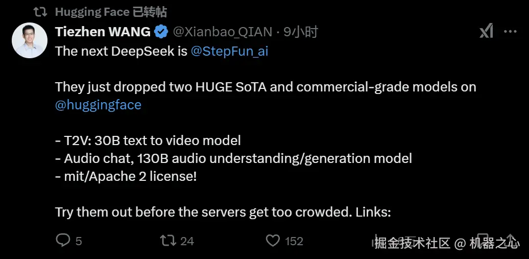 阶跃星辰的大模型在 AI 社区引发了关注。Hugging Face 工程师、前谷歌 TensorFlow 团队成员 Tiezhen Wang 表示,阶跃星辰简直就是下个 DeepSeek: