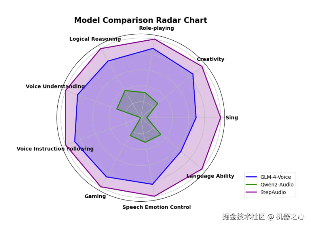 此外,根据阶跃自建并开源的多维度评估体系 StepEval-Audio-360 基准测试显示,Step-Audio 在逻辑推理、创作能力、指令控制、语言能力、角色扮演、文字游戏、情感价值等维度均取得了最佳成绩。