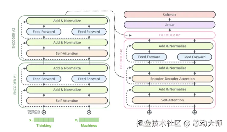 下图展示了更多细节:输入𝑥1,𝑥2经self-attention层之后变成𝑧1,𝑧2,然后和残差连接的输入𝑥1,𝑥2加起来,然后经过LayerNorm层输出给全连接层。全连接层也是有一个残差连接和一个LayerNorm层,最后再输出给上一层。