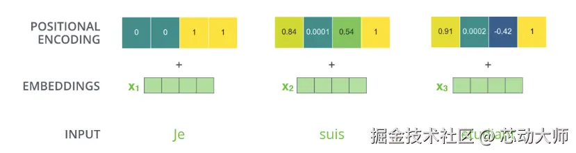 为了解决这个问题,我们需要引入位置编码,也就是t时刻的输入,除了Embedding之外(这是与位置无关的),我们还引入一个向量,这个向量是与t有关的,我们把Embedding和位置编码向量加起来作为模型的输入。这样的话如果两个词在不同的位置出现了,虽然它们的Embedding是相同的,但是由于位置编码不同,最终得到的向量也是不同的。