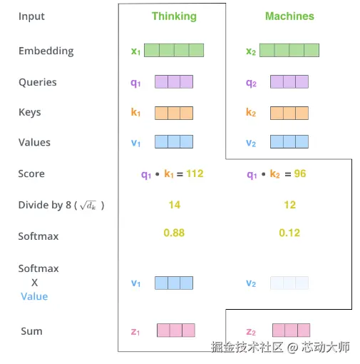 接下来使用softmax把得分变成概率,注意这里把得分除以8(𝑑𝑘)之后再计算的softmax,根据论文的说法,这样计算梯度时会更加稳定(stable)。计算过程如下图所示。