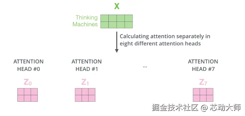 论文还提出了Multi-Head Attention的概念。其实很简单,前面定义的一组Q、K和V可以让一个词attend to相关的词,我们可以定义多组Q、K和V,它们分别可以关注不同的上下文。计算Q、K和V的过程还是一样,不过现在变换矩阵从一组(𝑊𝑄,𝑊𝐾,𝑊𝑉)变成了多组(𝑊𝑄0,𝑊𝐾0,𝑊𝑉0) ,(𝑊𝑄1,𝑊𝐾1,𝑊𝑉1)。如下图所示。