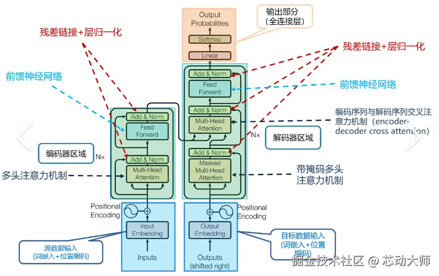 - 经过解码器的前馈网络后,输出层会生成一个概率分布,表示下一个可能的词。