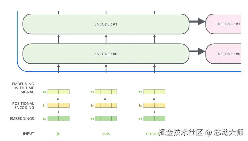 每一个Encoder的输入是下一层Encoder输出,最底层Encoder的输入是原始的输入(法语句子);Decoder也是类似,但是最后一层Encoder的输出会输入给每一个Decoder层,这是Attention机制的要求。