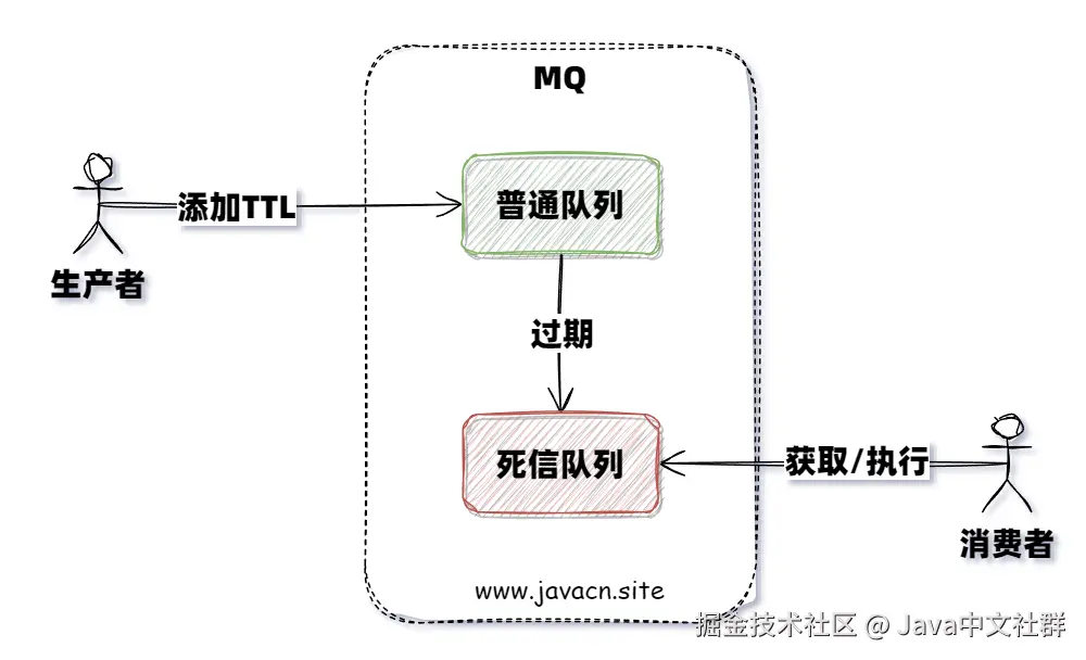 死信队列 + TTL 的实现流程如下:
