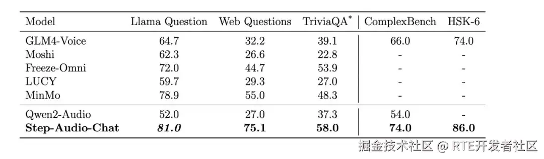 在 LlaMA Question、Web Questions 等 5 大主流公开测试集中,Step-Audio 模型性能均超过了行业内同类型开源模型,位列第一。Step-Audio 在 HSK-6(汉语水平考试六级)评测中的表现尤为突出,是最懂中国话的开源语音交互大模型。