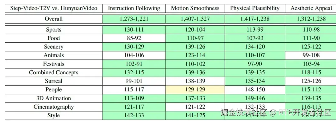 步骤4:DPO训练。 采用基于视频的DPO训练来提高生成视频的视觉质量,并确保更好地与用户提示对齐。 模型评测为了对开源视频生成模型的性能进行全面评测,我们构建并开源了针对文生视频质量评测的新基准数据集 Step-Video-T2V-Eval。该测试集包含 128 条源于真实用户的中文评测问题,旨在评估生成视频在运动、风景、动物、组合概念、超现实、人物、3D 动画、电影摄影等 11 个内容类别上质量。