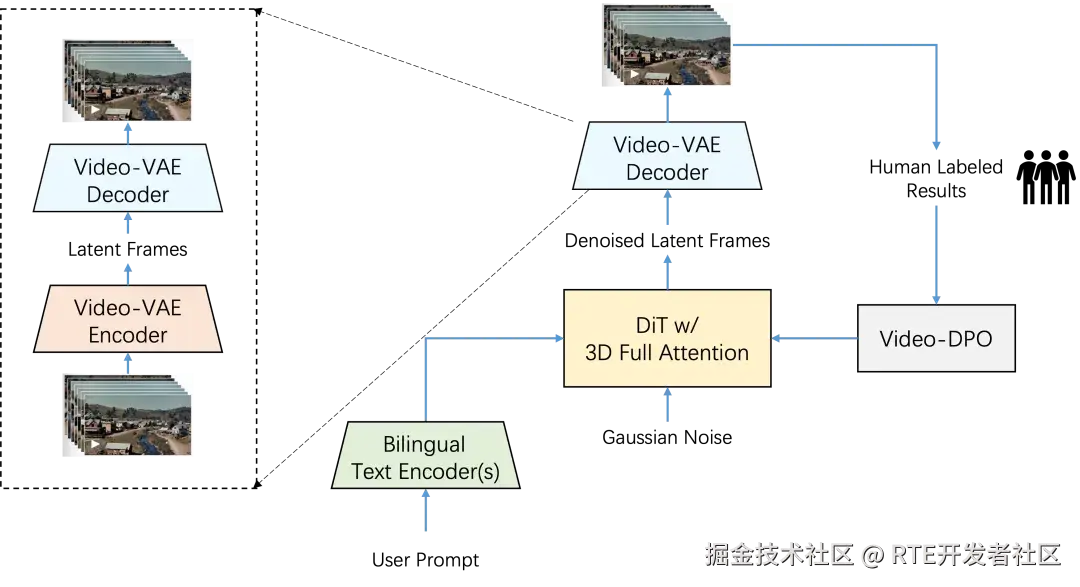 Step-Video-T2V 基于 DiT 模型,采用 Flow Matching 进行训练。视频 VAE 实现了 16x16 倍空间压缩和 8 倍时间压缩, 大大降低了大规模视频生成训练的计算复杂度。 两个双语文本编码器使 Step-Video-T2V 能够直接理解中文或英文提示。为了加速模型收敛并充分利用不同质量的视频数据集,Step-Video-T2V 采用级联训练流程,包括文本到图像预训练、文本到视频预训练、监督微调(SFT)和直接偏好优化(DPO)。