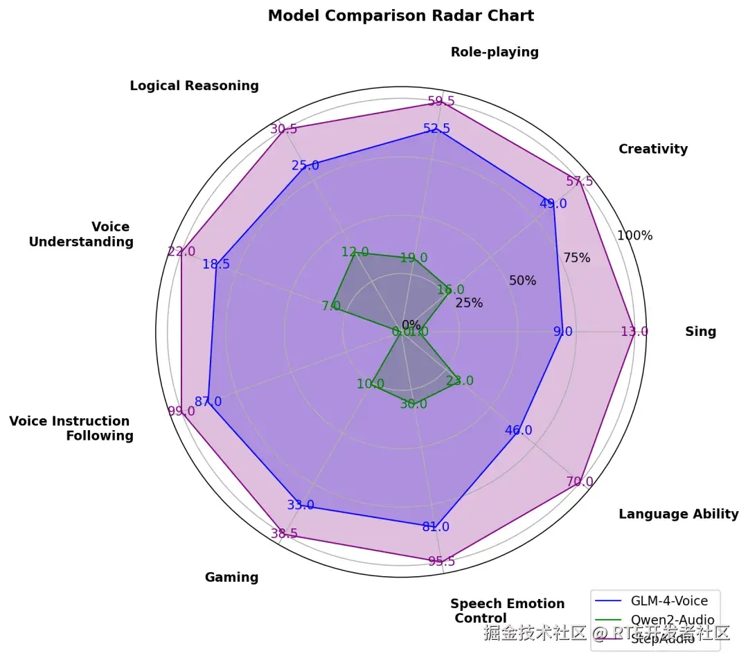 由于目前行业内语音对话测试集相对缺失,我们自建并开源了多维度评估体系 StepEval-Audio-360 基准测试,从角色扮演、逻辑推理、生成控制、文字游戏、创作能力、指令控制等 9 项基础能力的维度对开源语音模型进行全面测评。通过人工横评后的结果显示,Step-Audio 的模型能力十分均衡,且在各个维度上均超过了此前市面上效果最佳的开源语音模型。