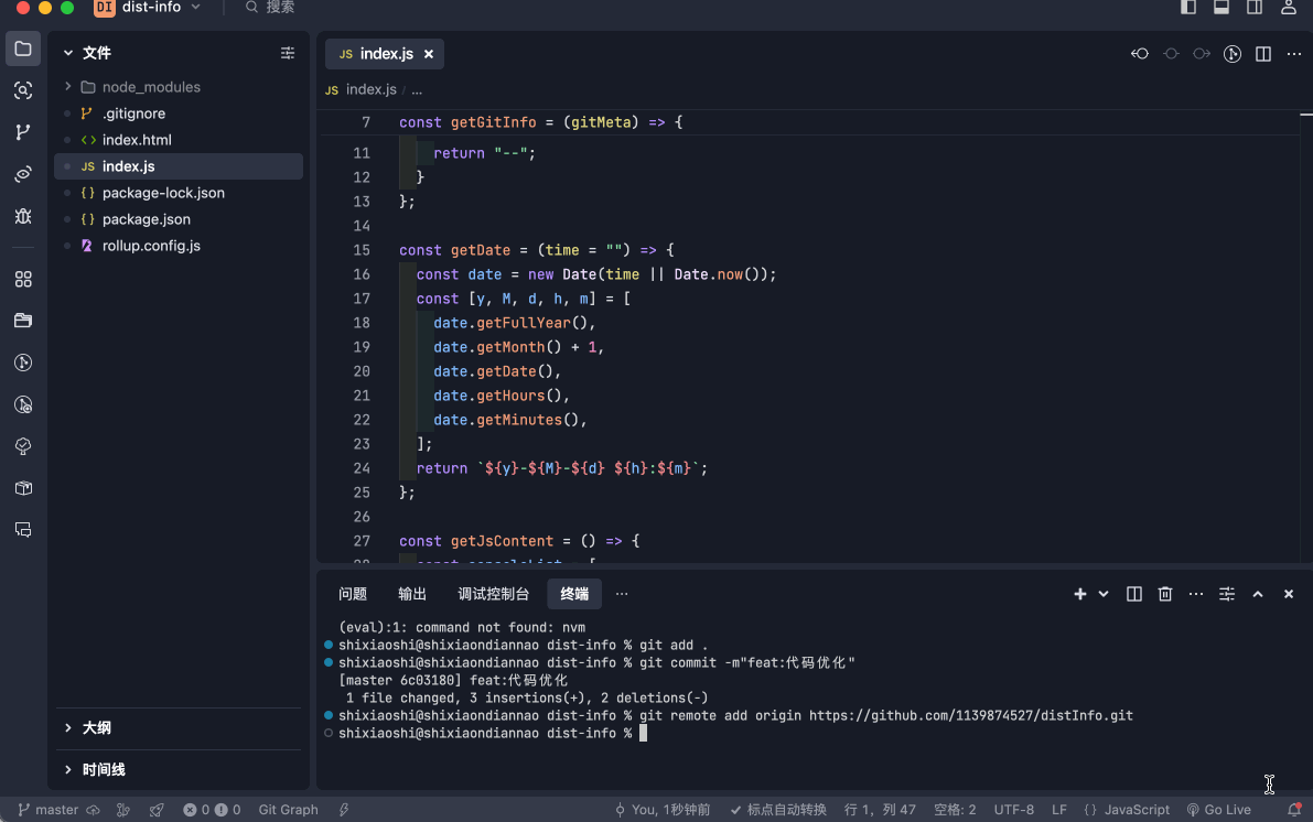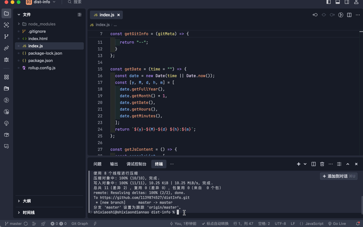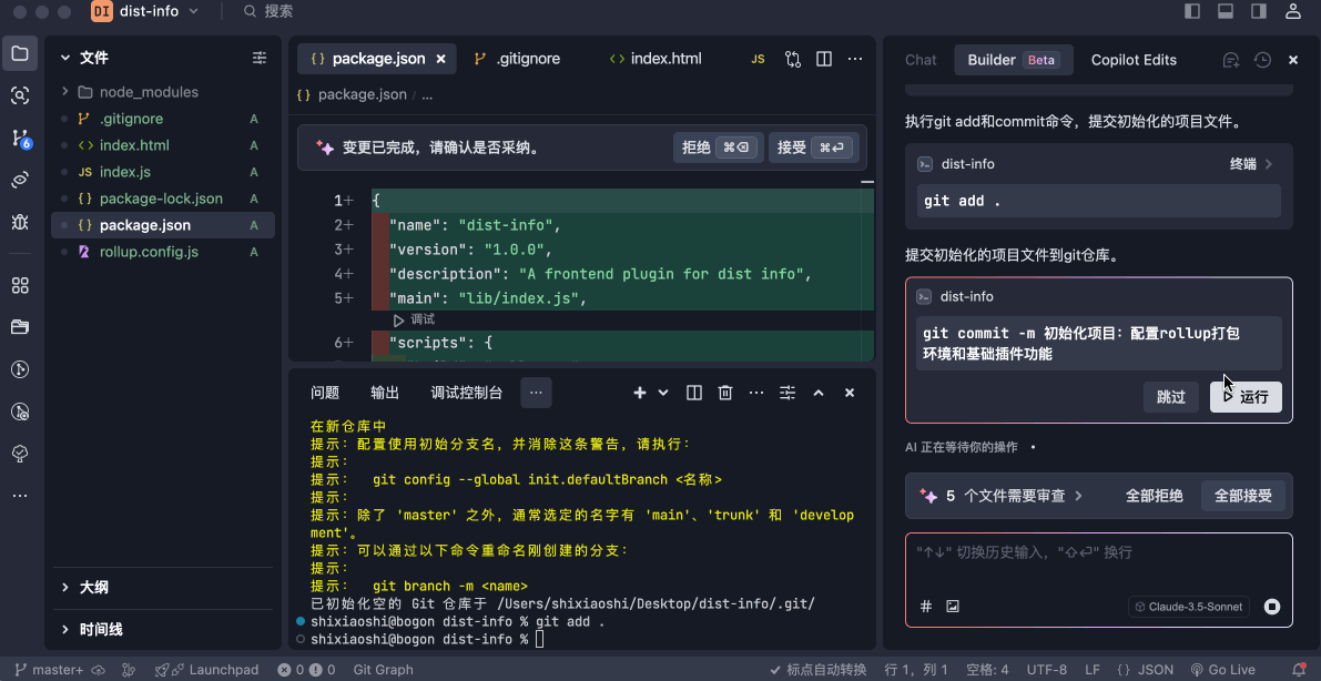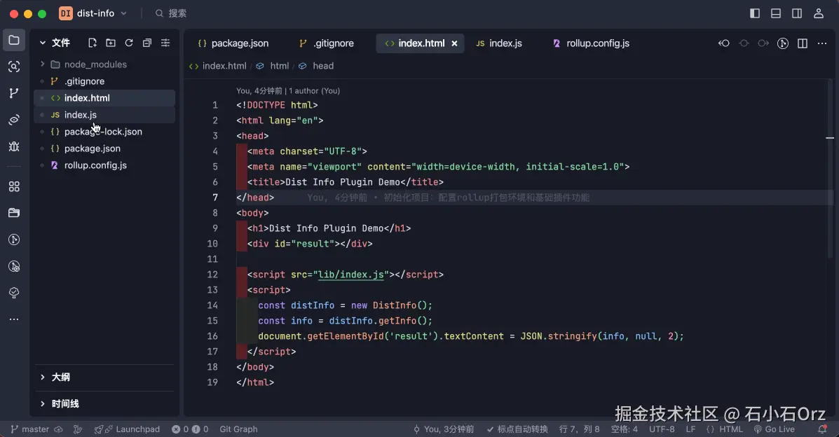 我要开发一个名为dist-info的前端插件,文件的核心逻辑位于根目录的index.js。插件使用rollup进行打包,打包输出的目录为lib/index.js。请帮我初始化git信息、安装配置好项目用到的rollup依赖(配置写在rollup.config.js文件中)。