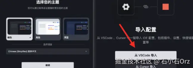 Trae支持mac和windows版本,我们根据官方的下载地址安装软件。安装Trae时,我们可以选择主题颜色,然后同步我们的Vsocde配置。