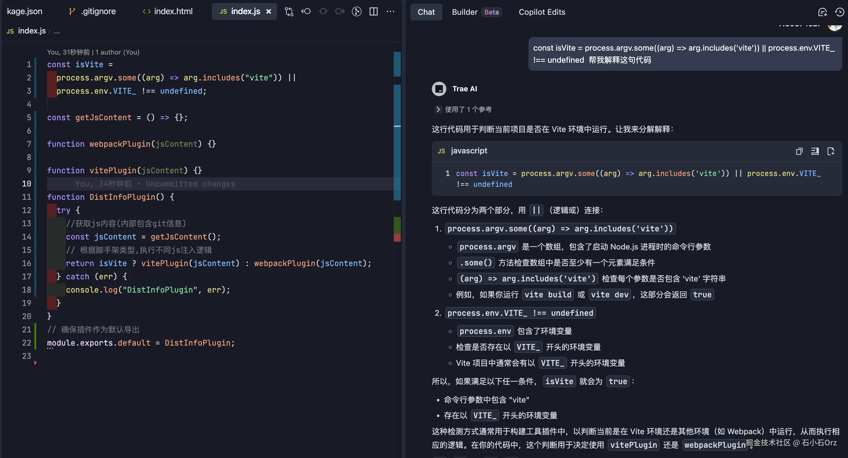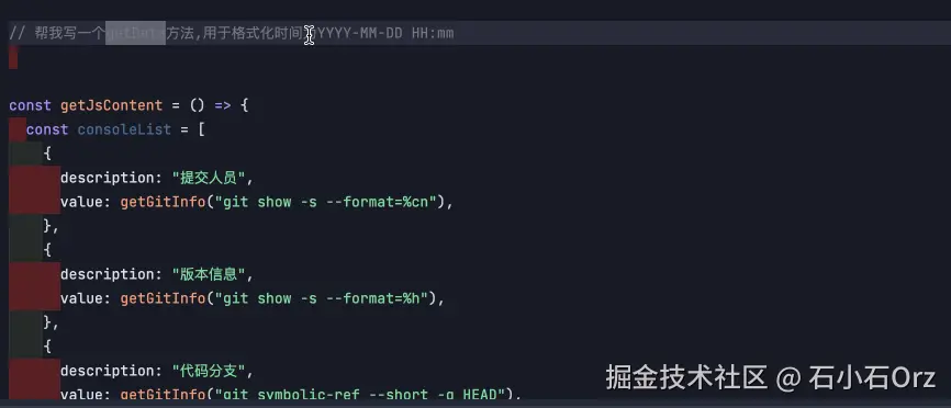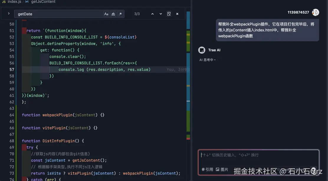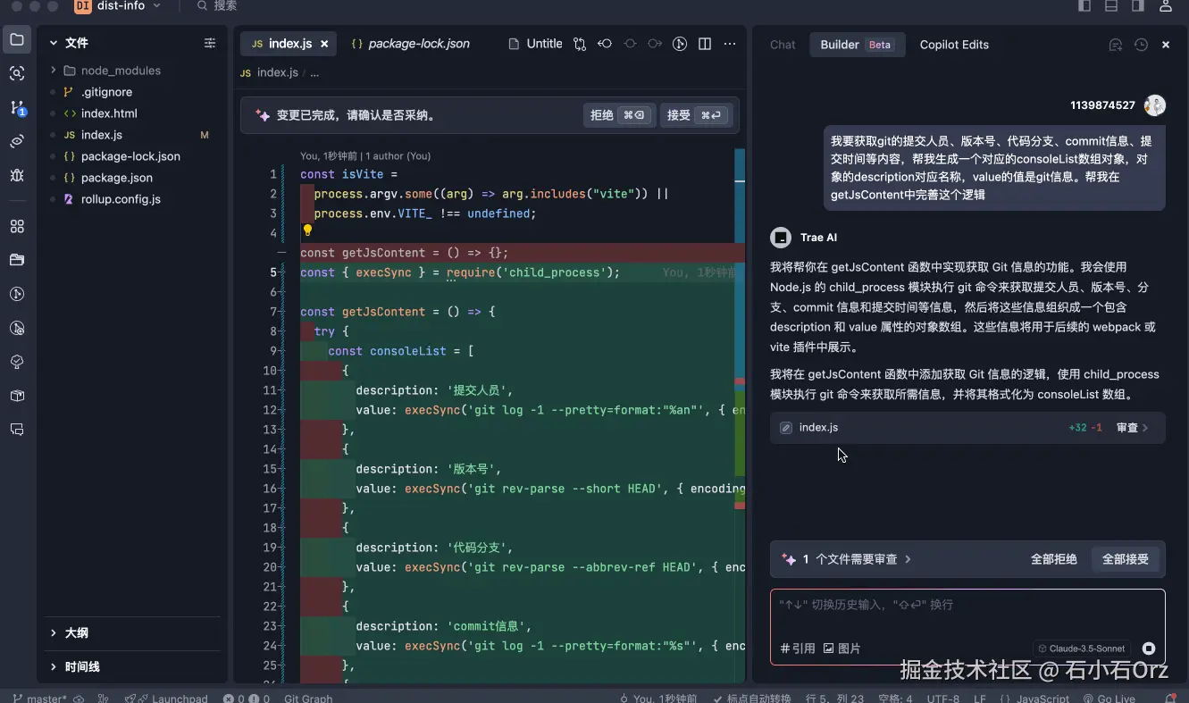 getJsContent的第一步应该是通过node获取git信息,我们通过Trae-Builder让Trae帮我们完善代码。
