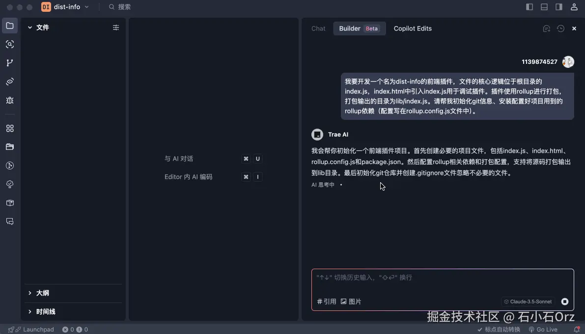 Trae提供了一个Trae-Builder模式,可以轻松完成从零到一的项目构建。在 Builder 模式下,我们对代码文件的任何更改都会自动保存。