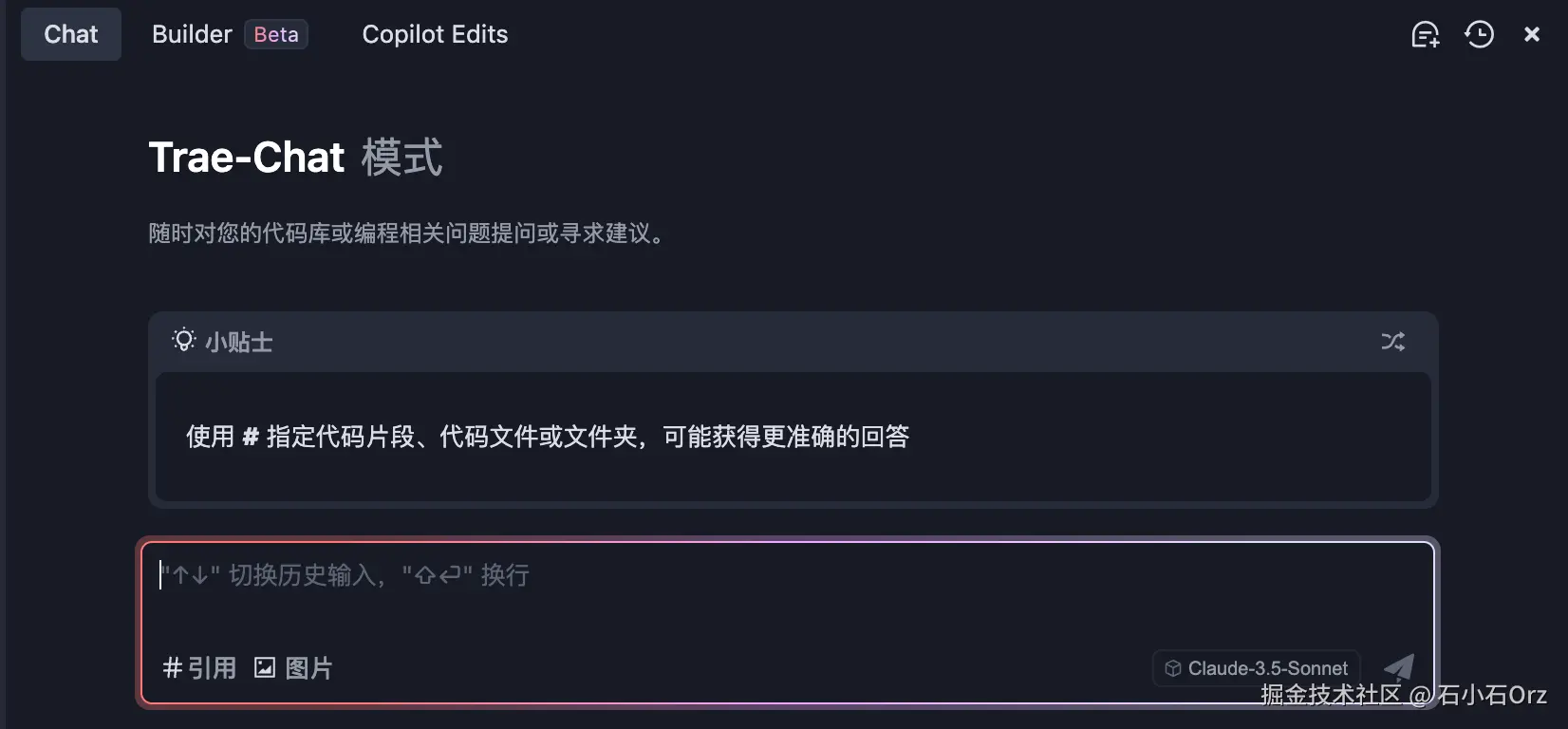 Trae提供了一个Trae-Chat模式,它可以对我们的代码或编程问题进行提问。通过Trae-Chat,可以极大提升开发效率。