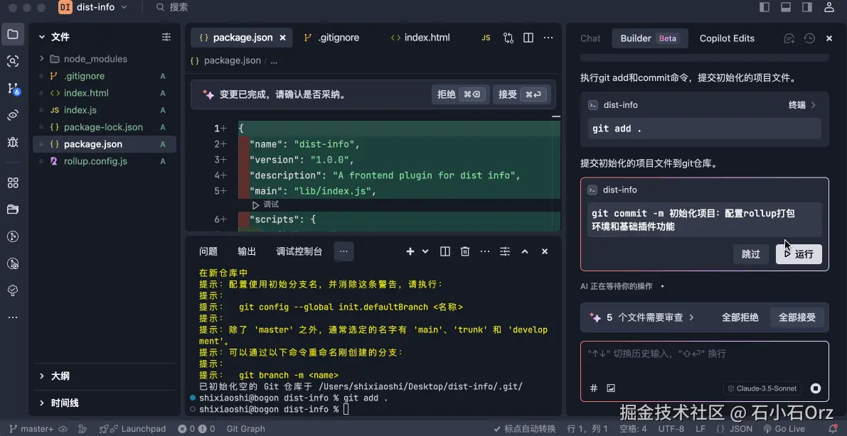 Trae-Builder运行完毕后,一个完成的项目就被快速创建出来了。现在,我们只需要审查项目,保留删减代码即可。