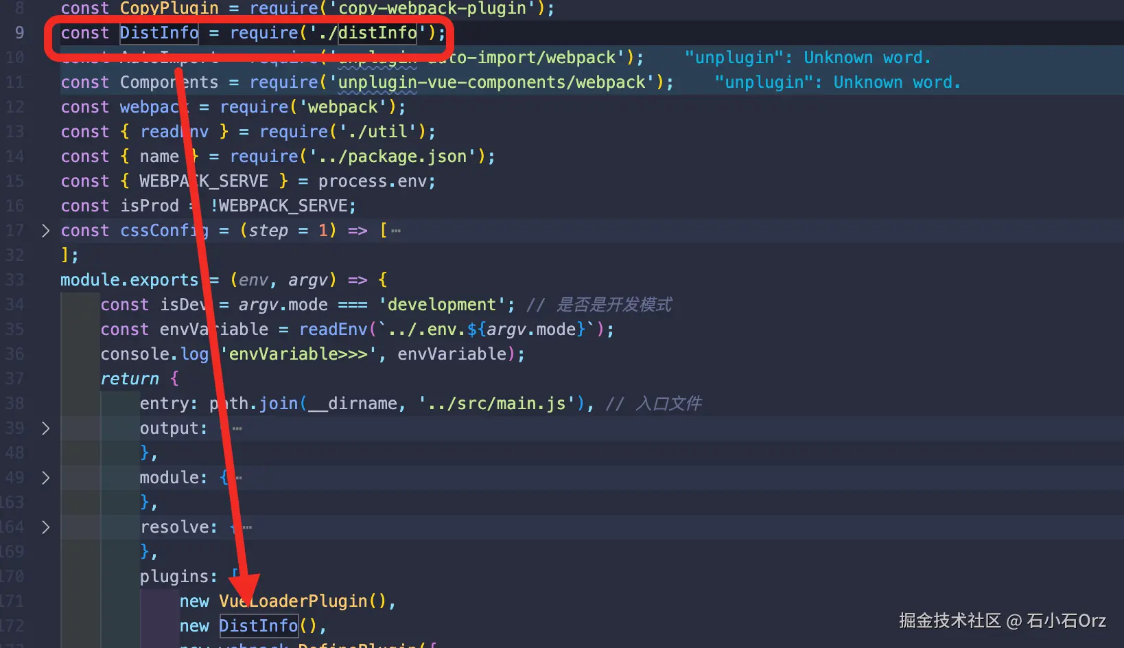 如图,在webpack项目中引入代码(distInfo就是开发的插件代码)