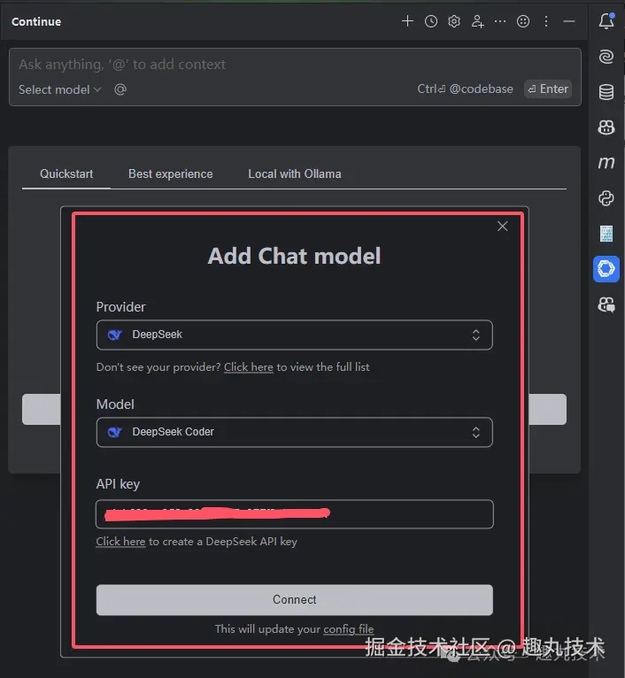 打开IDEA,点击右侧边栏的 Continue图标 → Settings , 在 Select model 中选择 Add Chat model 并添加DeepSeek模型和DeepSeek Coder,再填写DeepSeek API Key。